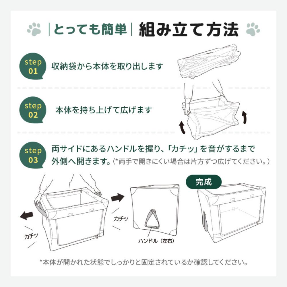 ・組み立て、収納時や使用時は、近くにお子さまや愛犬を近づけないでください。 ・愛犬は思わぬ動作をしますので、さまざまな条件により破損したりする場合があります。 飼い主さまの責任において充分な安全管理を行なってください。 ・お子さまに組み立て・収納をさせないでください。 ・本製品の中に人が入ったり、上に乗ったりしないでください。また本体の上に物を置いたり、積み重ねたりしないでください。 ・水平でない場所や、段差のある場所には設置しないでください。必ず平らな場所に完全に組み立ててから使用してください。 ・ストーブなどの暖房器具や火気の近くでは使用しないでください。破損や変形の原因となります。 ・万一落下や強い衝撃により、ひび割れ・破損・変形が生じた場合は、ただちに使用を中止してください。 ・濡れたまま放置しないでください。色が他の物に移ることがあります。 ・長時間直射日光に当てたり、野外に放置しないでください。 ・使用前は必ず、変形や破損、各部に緩みやガタつきなどがないことを確認してください。   ・製品いずれかの部品に異常が見られる場合は、使用しないでください。 ・クレート内に複数の愛犬を入れないでください。 ・狭い空間に不慣れな愛犬への使用は愛犬にストレスを与えます。短時間ずつ慣らしてから様子を見て使用してください。 ・愛犬に異変を感じた時は、すぐに使用を中止してください。 ・愛犬を中に入れたまま長時間放置しないでください。 ・愛犬が逃げ出さないように、使用時はファスナーを閉めてロックをかけてください。 ・本製品は航空輸送用クレートではありません。航空輸送には使用しないでください。 ・本製品を廃棄する際は、お住まいの各自治体の区分にしたがってください。 ・本製品を分解したり、改造はしないでください。正常な強度を保てなくなったり思わぬ事故の原因となります。