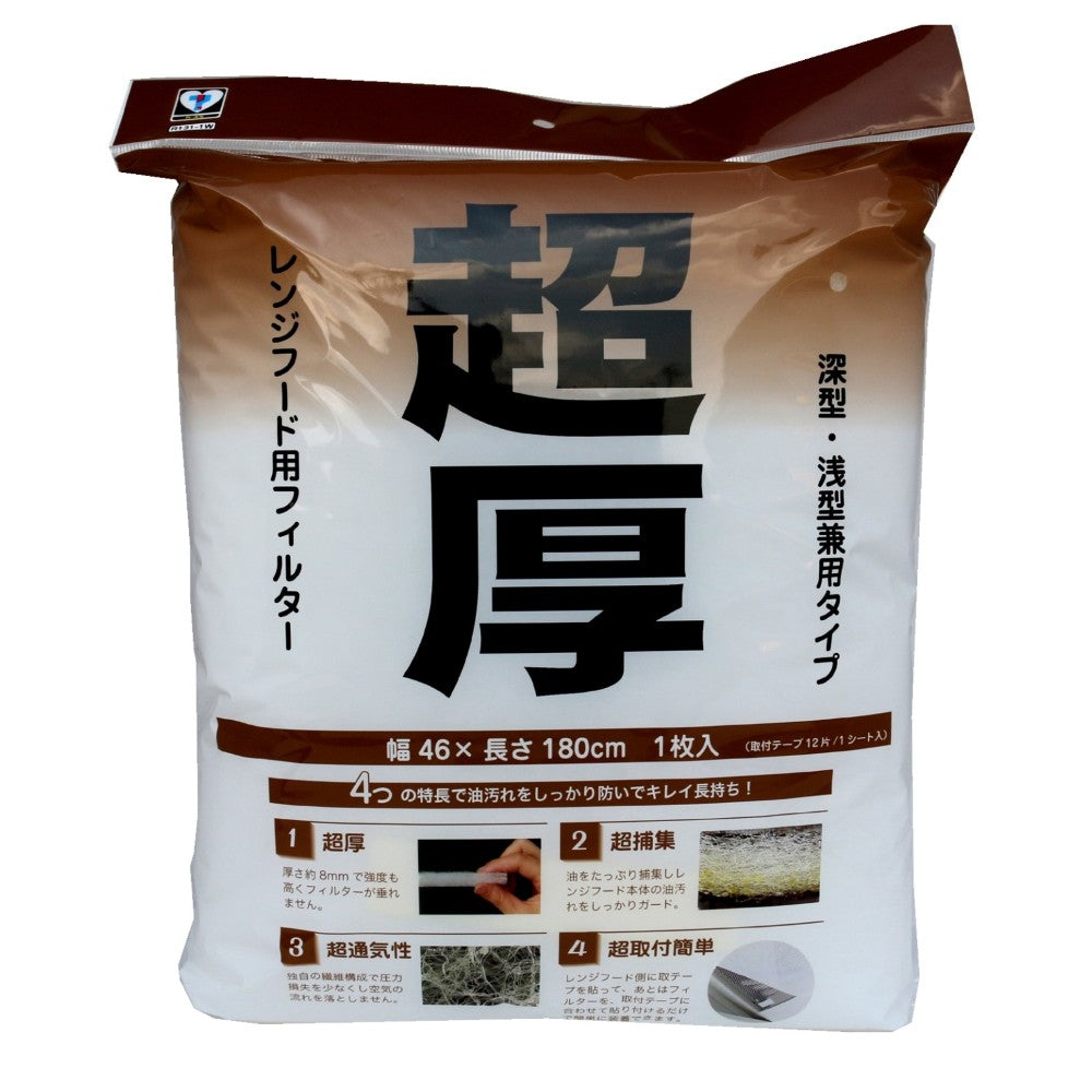 ●深型レンジフード・浅型レンジフード兼用タイプ。サイズに合わせて自由にカットして使えます。便利な取付テープ12片付きで楽々取り付け。資源リサイクルの再生PET使用で地球に優しいフィルターです。
