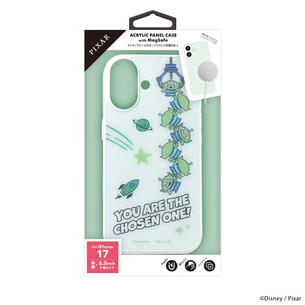 「PG-D25AMP04LGM」は、ピクサーキャラクターデザインの各種MagSafeアクセサリーに対応したiPhone 17用 アクリルパネルケースです。