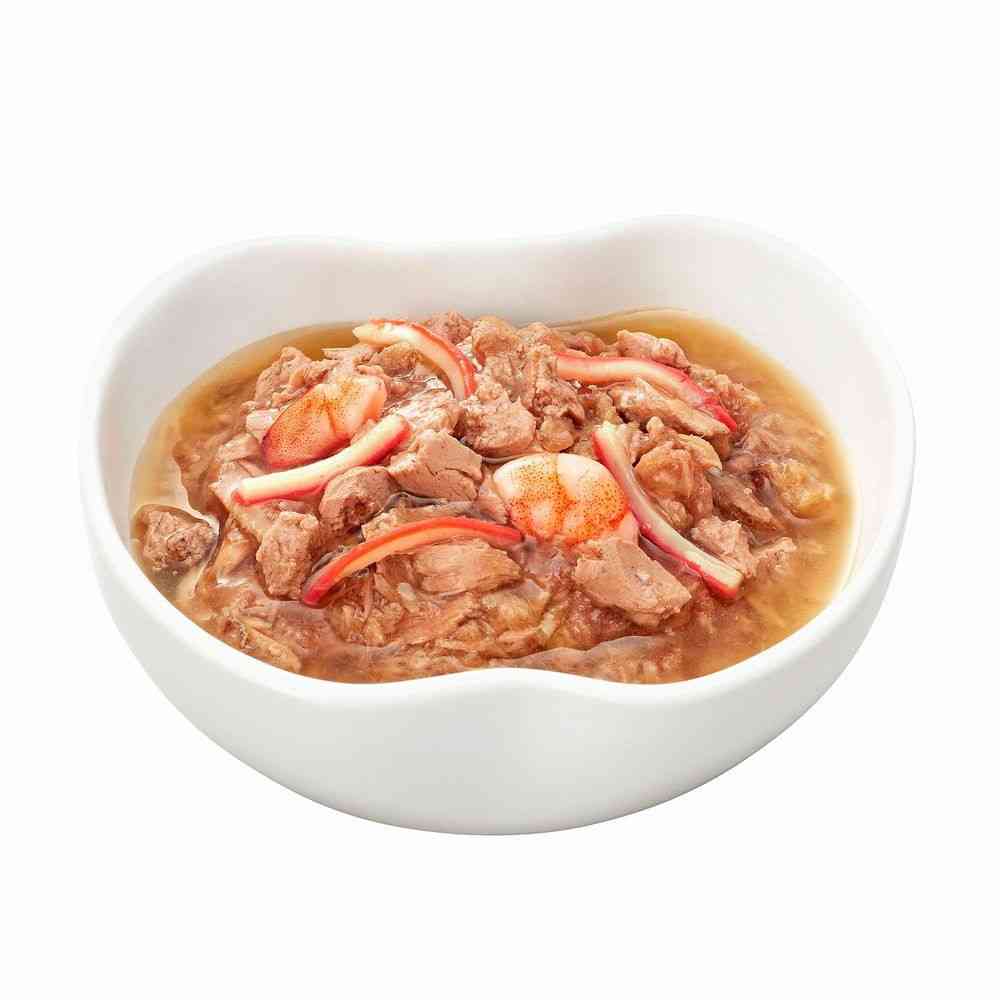 魚介類(カツオ、マグロ、青魚、えび、かにかま、フィッシュペプチド)、鶏肉、油脂類(鶏脂、大豆油)、たんぱく加水分解物、小麦グルテン、糖類(ショ糖、オリゴ糖)、乾燥全卵、エンドウたんぱく、乾燥卵黄、増粘安定剤(加工でん粉、増粘多糖類)、調味料、ミネラル類(Ca、P、Fe、Cu、Mn、Zn、I、Se)、ポリリン酸Na、キシロース、ビタミン類(A、D、E、K、B1、B2、B6、B12、ナイアシン、パントテン酸、葉酸、ビオチン、コリン)、タウリン