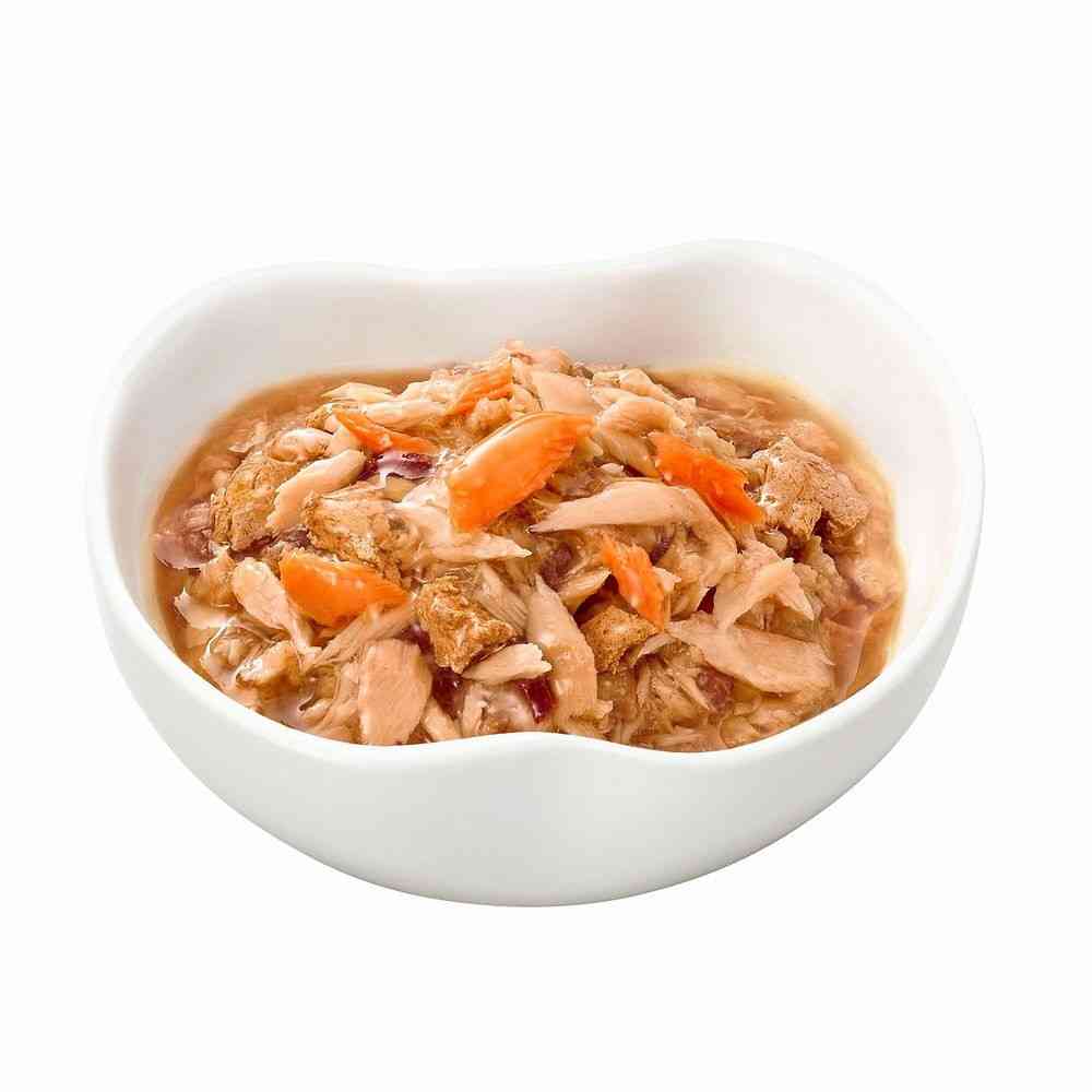 魚介類(カツオ、サーモン、マグロ、青魚、フィッシュペプチド)、鶏肉、油脂類(鶏脂、大豆油)、たんぱく加水分解物、小麦グルテン、糖類(ショ糖、オリゴ糖)、乾燥全卵、エンドウたんぱく、乾燥卵黄、増粘安定剤(加工でん粉、増粘多糖類)、調味料、ミネラル類(Ca、P、Fe、Cu、Mn、Zn、I、Se)、ポリリン酸Na、キシロース、ビタミン類(A、D、E、K、B1、B2、B6、B12、ナイアシン、パントテン酸、葉酸、ビオチン、コリン)、タウリン