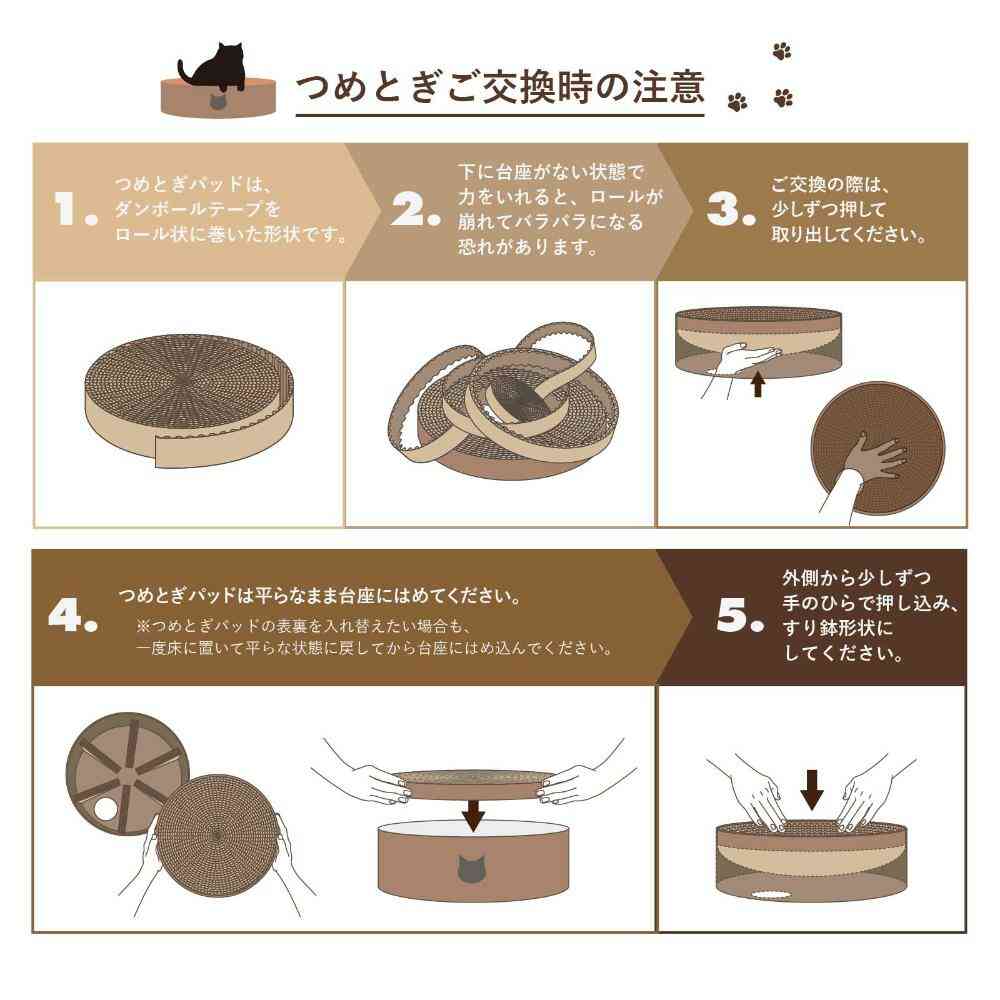 ・ツメとぎ交換時は、必ず台座にツメとぎをはめ込んで軽い力でゆっくりと形を整えてください。