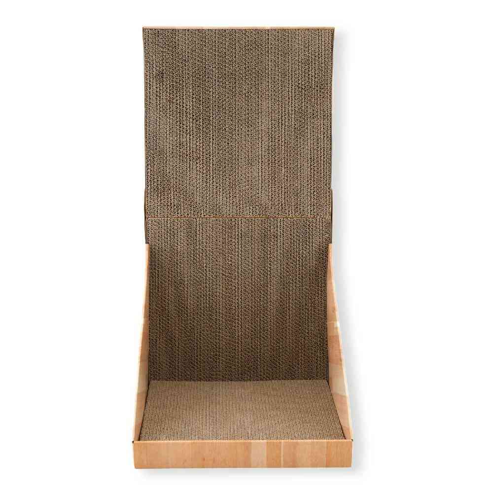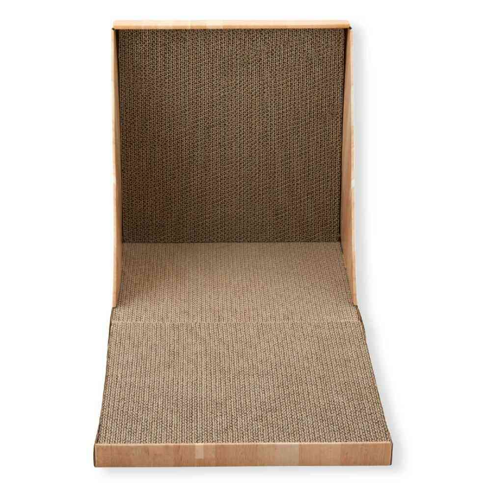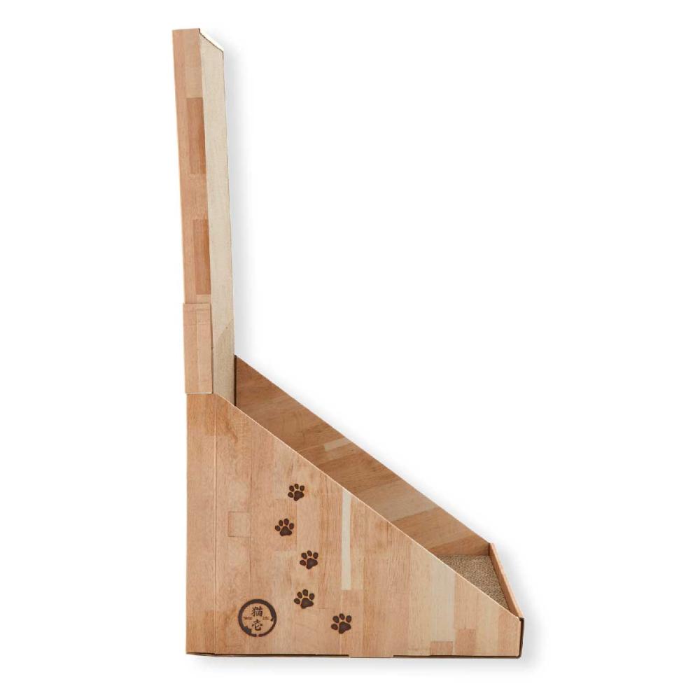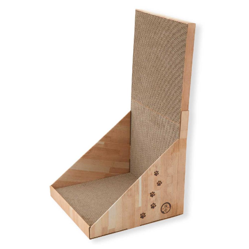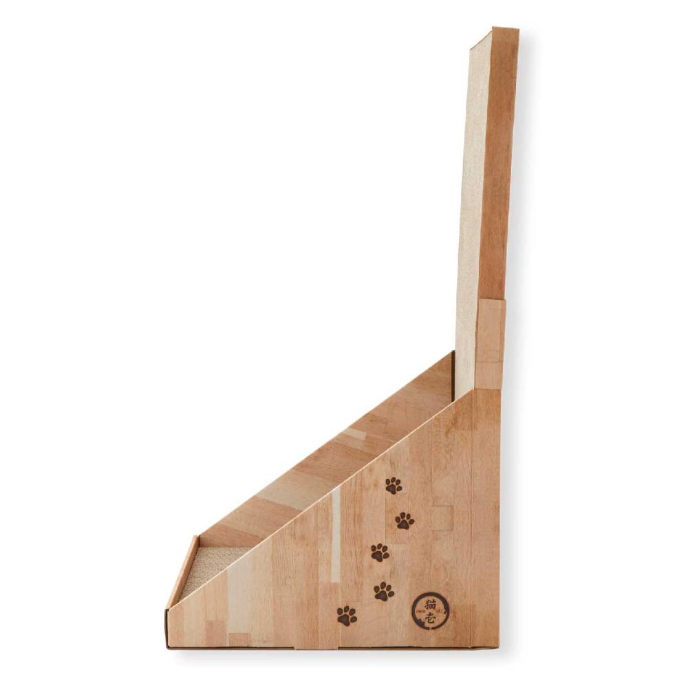 バリバリボードは高さ70cmの大きめサイズですが、シンプルな木目調デザインなので、リビングのど真ん中に置いても、お家のインテリアを邪魔しません。側面には猫壱のロゴと、猫壱ではおなじみの猫ちゃんの肉球模様を加え、シンプルな中にも愛らしさもも忘れていません。