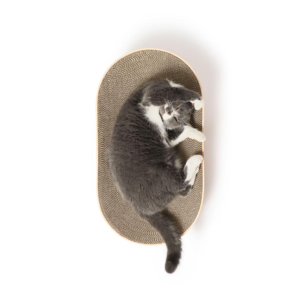 幅60cmののびのび設計なので、猫がつめとぎの上で、両手両足をついてしっかりとからだを伸ばして、つめとぎを楽しむことができます。猫はリラックスしてからだを伸ばしている時に、幸福ホルモンを放出すると言われています。つめとぎ後には、広々ベッドでくつろいで、猫だけの幸せ空間に。