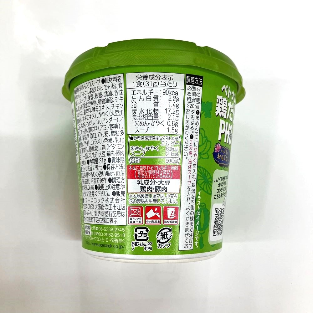 つるっと滑らかで、米の風味が香るベトナム仕込みのめん。鶏だしに香味野菜の旨み、胡椒やシナモン等の香辛料の風味がアクセントのスープ。大豆そぼろ、ねぎ、もやし、コリアンダー入り。