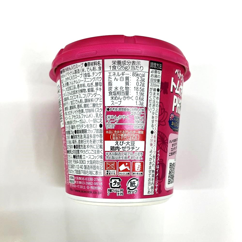 つるっと滑らかで、米の風味が香るベトナム仕込みのめん。海老だしに香辛料や複数種のスパイスを加えた酸味と辛味のあるトムヤムクン風スープ。チンゲン菜、大豆そぼろ、ねぎ、唐辛子、コリアンダー入り。