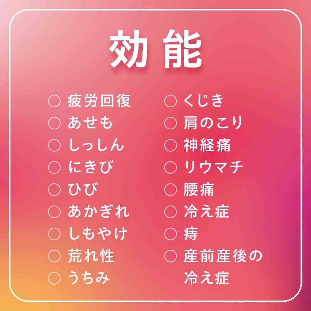 疲労回復、あせも、しっしん、にきび、ひび、あかぎれ、しもやけ、荒れ性、うちみ、くじき、肩のこり、神経痛、リウマチ、腰痛、冷え症、痔、産前産後の冷え症