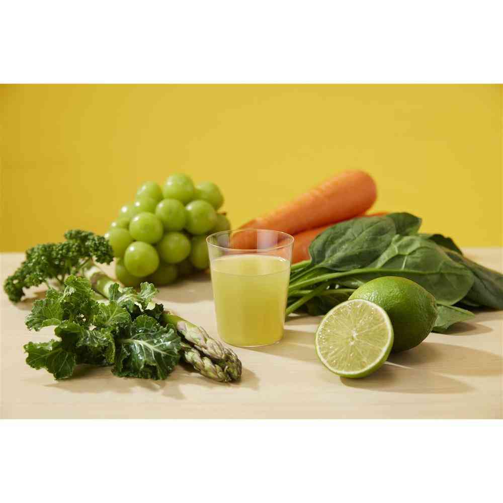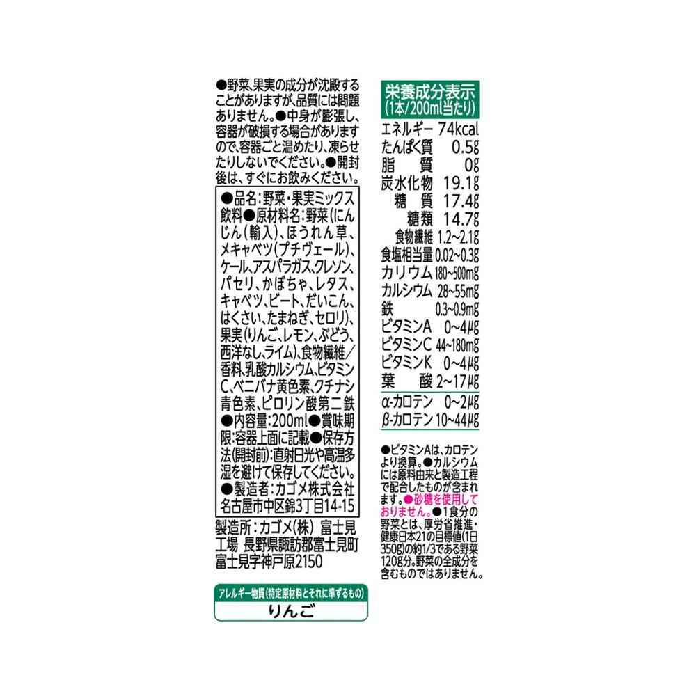 ■原材料名 野菜(にんじん(輸入)、ほうれん草、メキャベツ(プチヴェール)、ケール、アスパラガス、クレソン、パセリ、かぼちゃ、レタス、キャベツ、ビート、だいこん、はくさい、たまねぎ、セロリ)、果実(りんご、レモン、ぶどう、西洋なし、ライム)、食物繊維/香料、乳酸カルシウム、ビタミンC、ベニバナ黄色素、クチナシ青色素、ピロリン酸第二鉄 ■栄養成分 1本(200ml)あたり エネルギー74kal たんぱく質0.5g 脂質0g 炭水化物19.1g 糖質17.4g 食物繊維1.2g 食塩相当量0.02〜0.3g