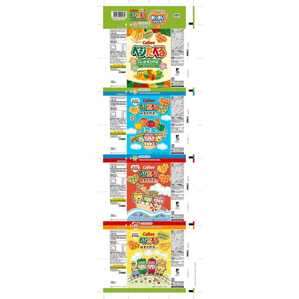 5種類の緑黄色野菜入りで、緑・黄・赤の3種類の色とそれぞれの程よい野菜のおいしさが、楽しめるハート型のスナックです。大きさ約2倍の赤いおっきいハートが、見つかるかな!?でたらハッピー!!おっきいハート。