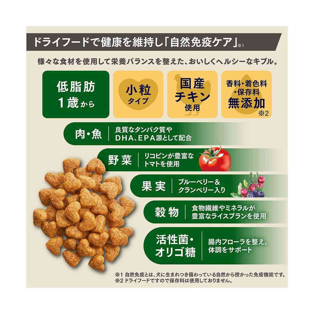 【ドライフード】穀類(トウモロコシ、コーングルテンミール、小麦ブラン、小麦粉、ライスブラン)、肉類(チキンミール、チキンレバーパウダー)、油脂類(動物性油脂、植物性油脂(オメガ-6脂肪酸含む))、魚介類(フィッシュエキスパウダー、マリンコラーゲン、小魚粉末(DHA、EPA/オメガ-3脂肪酸源))、ビール酵母(β-グルカン源)、乳酸菌加熱菌体、糖類(オリゴ糖、エリスリトール)、カゼインホスホペプチド、果実類(クランベリーパウダー、ブルーベリーパウダー(アントシアニン源))、トマト(リコピン源)、L-カルニチン、ミネラル類(カルシウム、リン、カリウム、クロライド、鉄、銅、マンガン、グルコン酸亜鉛、硫酸亜鉛、ヨウ素、コバルト)、ビタミン類(A、B2、B6、B12、D、E、パントテン酸、コリン)、バチルスサブチルス(活性菌)、酸化防止剤(ミックストコフェロール、ローズマリー抽出物)、アミノ酸類(アルギニン、タウリン、メチオニン)、グルコサミン、コンドロイチン、ヒアルロン酸
