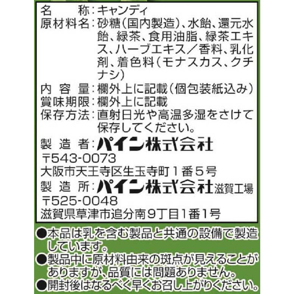 砂糖(国内製造)、水飴、還元水飴、緑茶、食用油脂、緑茶エキス、ハーブエキス/香料、乳化剤、着色料(モナスカス、クチナシ)