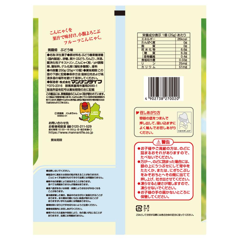 ぶどう糖果糖液糖(国内製造)、砂糖、果汁(ぶどう、りんご)、洋酒、難消化性デキストリン、こんにゃく粉/pH調整剤、酸味料、ゲル化剤(増粘多糖類)、香料