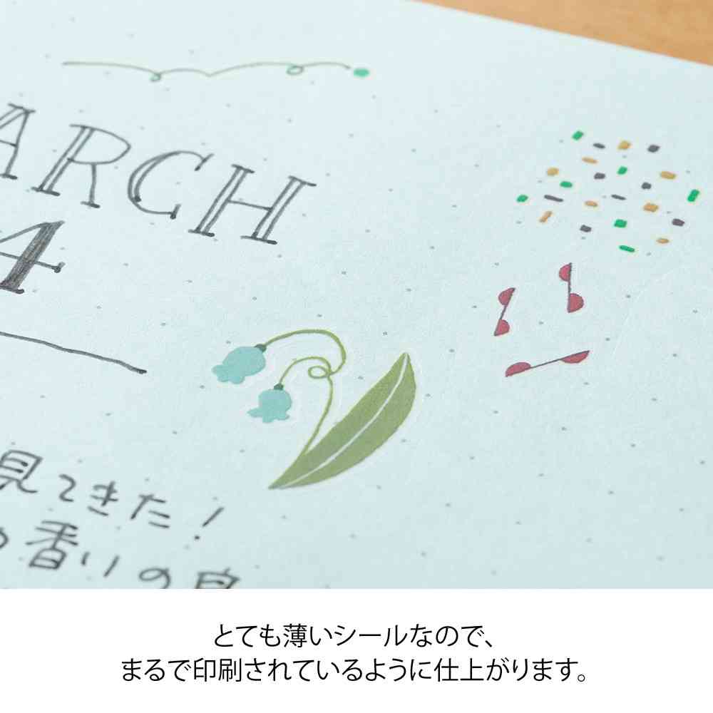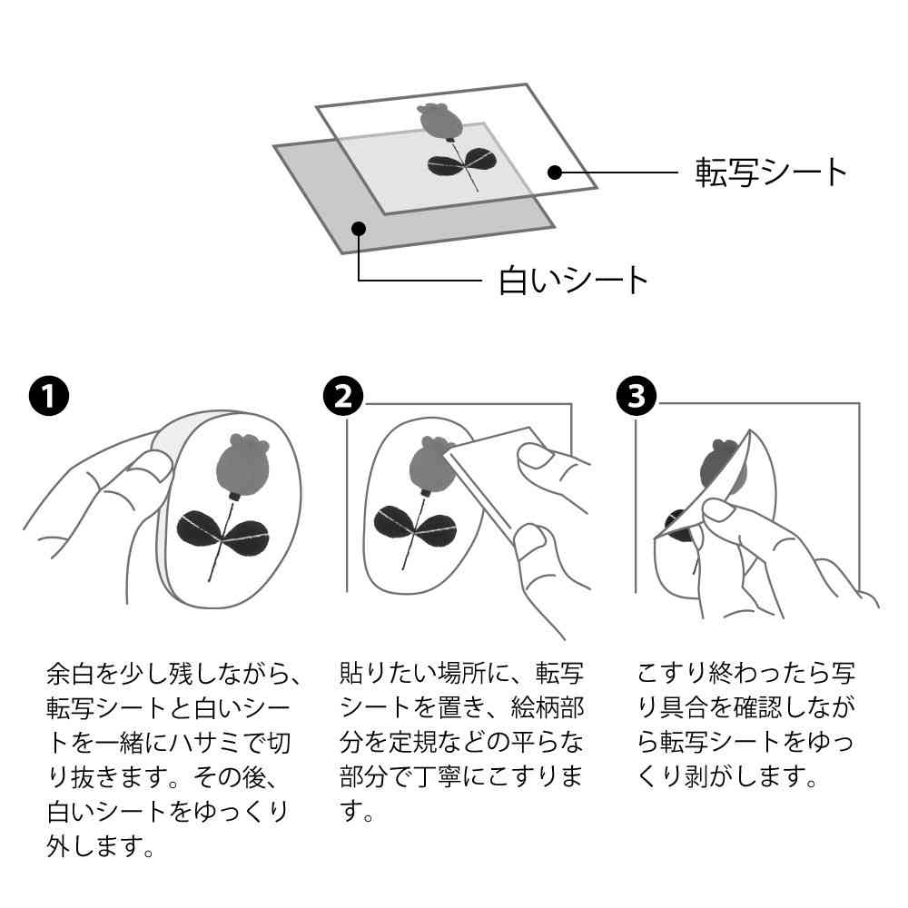 軽い力でこすると、絵を描いたように紙と一体化する転写タイプのシールです。