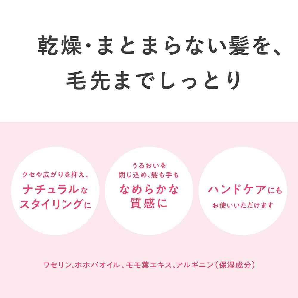保湿成分配合で乾燥対策重視。毛先までしっとりまとまる髪に。手肌にも使える。