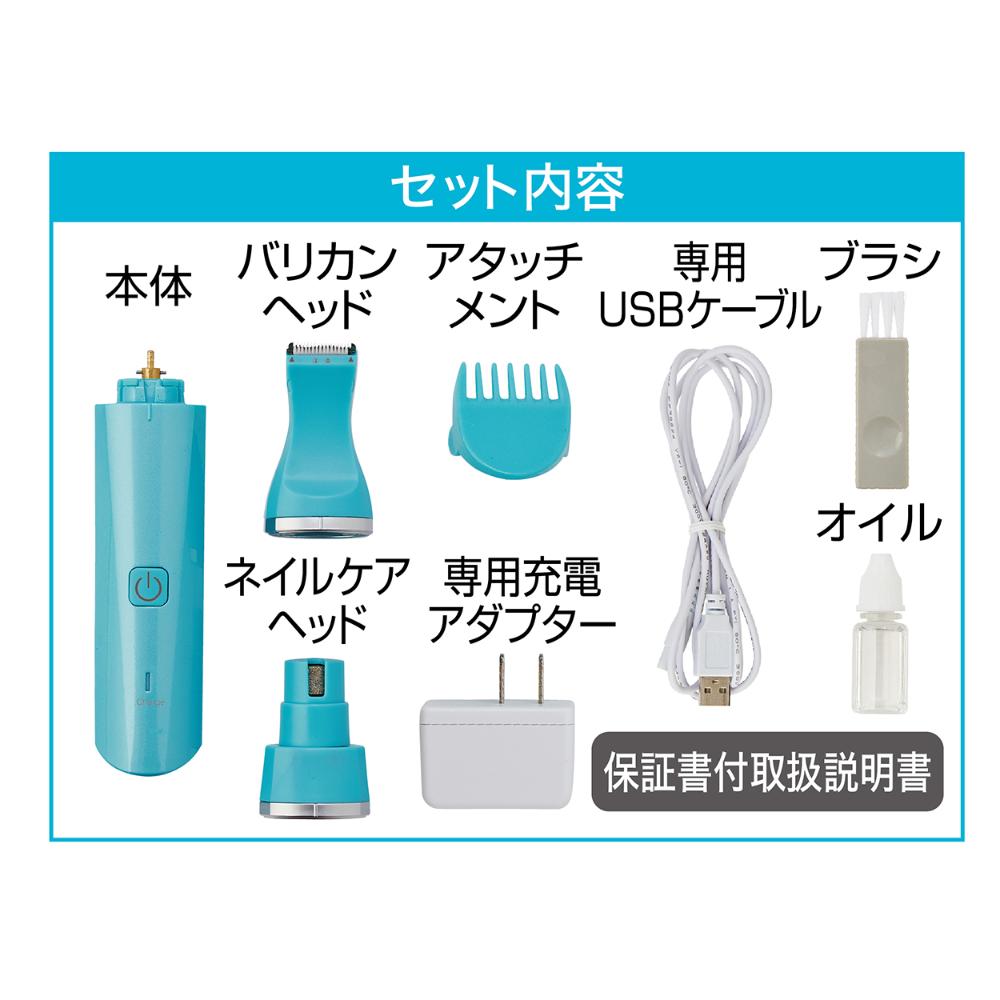 ・セット内容:本体、バリカンヘッド、ネイルケアヘッド、アタッチメント、充電アダプター、USBケーブル(約1.5m)、刃部用潤滑オイル(4mL)、掃除用ブラシ、保証書付取扱説明書