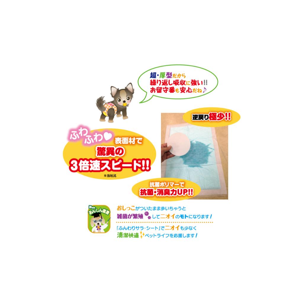 驚きの3倍速吸収スピードで、長時間使用しても安心の超・厚型ペットシーツです。抗菌ポリマーで清潔。逆戻り極小で足裏・お腹を汚しません。おしっこした瞬間から水分とニオイを閉じ込め、トイレの悩みであるニオイや足ヌレを解消します!