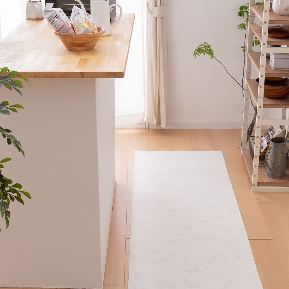 サッと拭けてお手入れ簡単素材。木目調、石目調とデザイン豊富。サイズもたくさんあってDIYにも最適な、床材でありアクセントラグでもあるクッションフロア。