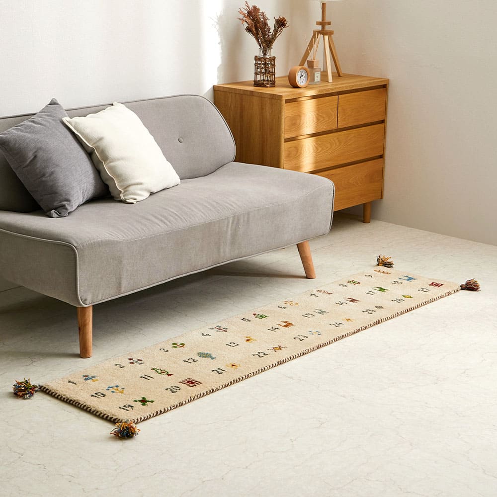 インドの職人が一枚一枚丁寧に織り上げた一点もの。ウ-ル素材は暖かく冬に適しているイメ-ジがありますが、温度差の激しい環境で育った羊から取れる羊毛は、保温性と湿度を調節する機能に優れています。夏の湿気にも適しておりオ-ルシ-ズンご使用いただける素材です。しっかりとした密度と厚みで、ふかふかな踏み心地をお楽しみいただけます。裏面も同素材で床にやさしい仕様です。四隅にはタッセルをあしらい、愛らしさをプラスしました。