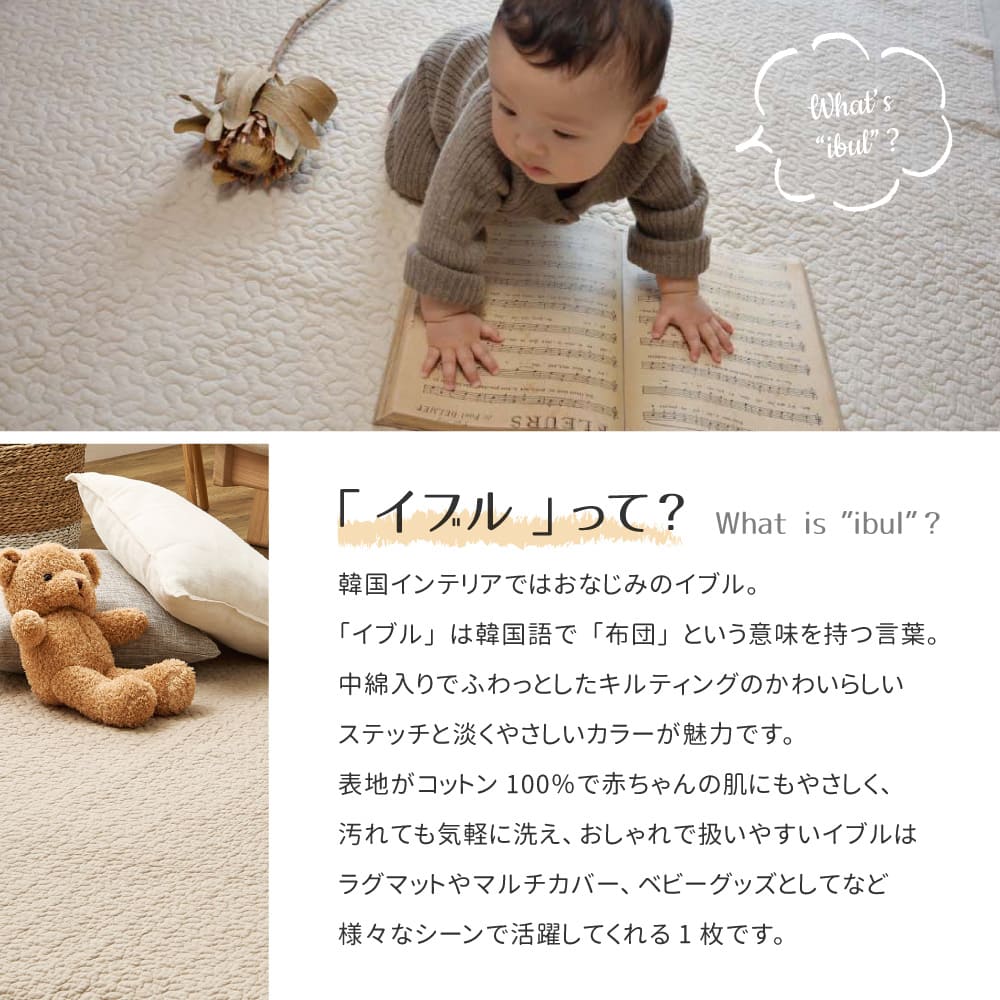 韓国インテリアでおなじみの「イブル」のラグ。コットン100%で赤ちゃんの肌にもやさしく、中綿が入ったキルティング生地でふわっとやわらかな肌ざわり。ナチュラルなカラーでいろんなお部屋に合わせやすく、汚れても洗えるウォッシャブル仕様でいつも清潔に使えます。裏に滑り止めが付いているからズレにくくて安心!ギフトにもぴったりな、リボン付きの簡易ラッピング仕様になっています。