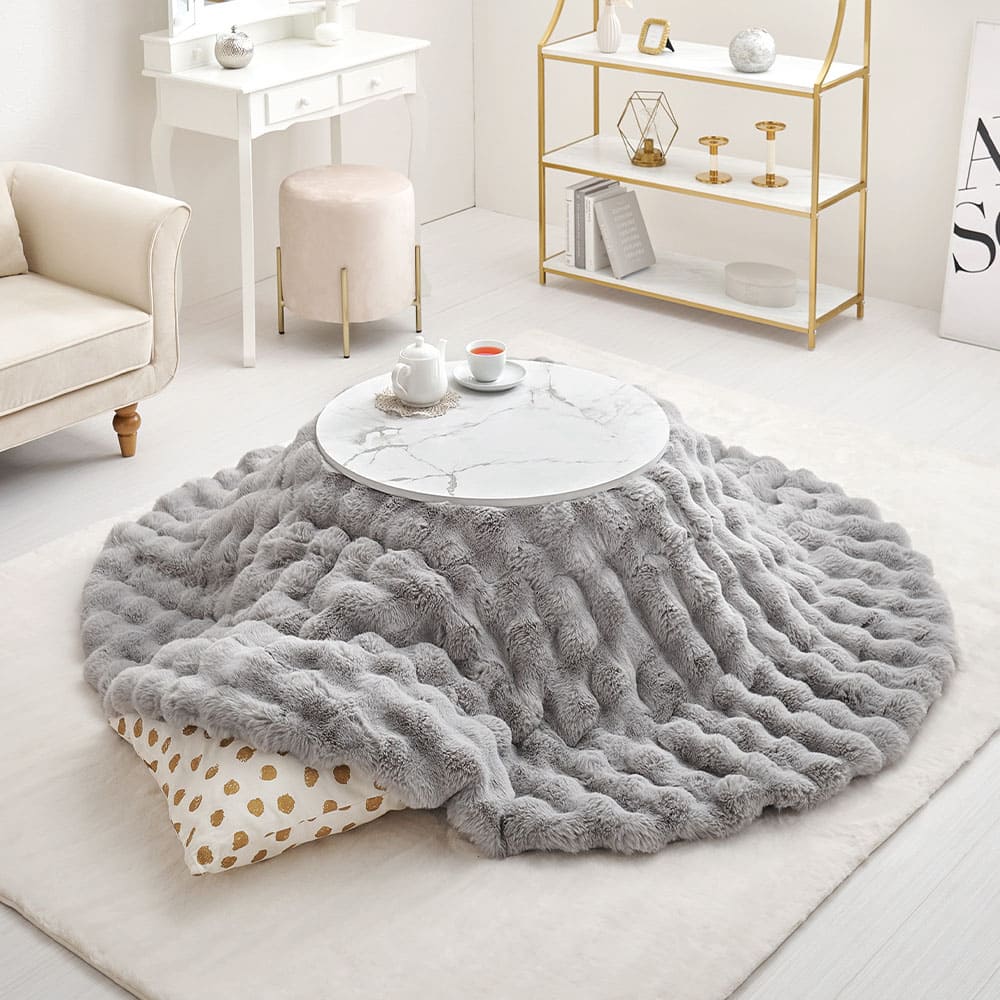 うさぎの毛並みを表現した「ラビットファー調」は、きめ細やかでうっとりするような、なめらかな肌ざわり。やさしく包み込むようなふわふわタッチに、ぽこぽことした見た目も可愛いおしゃれなこたつ布団です。かさばらずすっきりと使いやすい薄掛けタイプのこたつ布団ですが、たっぷりの中わた入りでボリュームがあり、ぎゅっと詰まった高密度な長毛パイルが空気を多く含み、あたたかさを保ち快適に。また、洗濯機で洗えるから汚れても安心、いつも清潔にお使いいただけます。