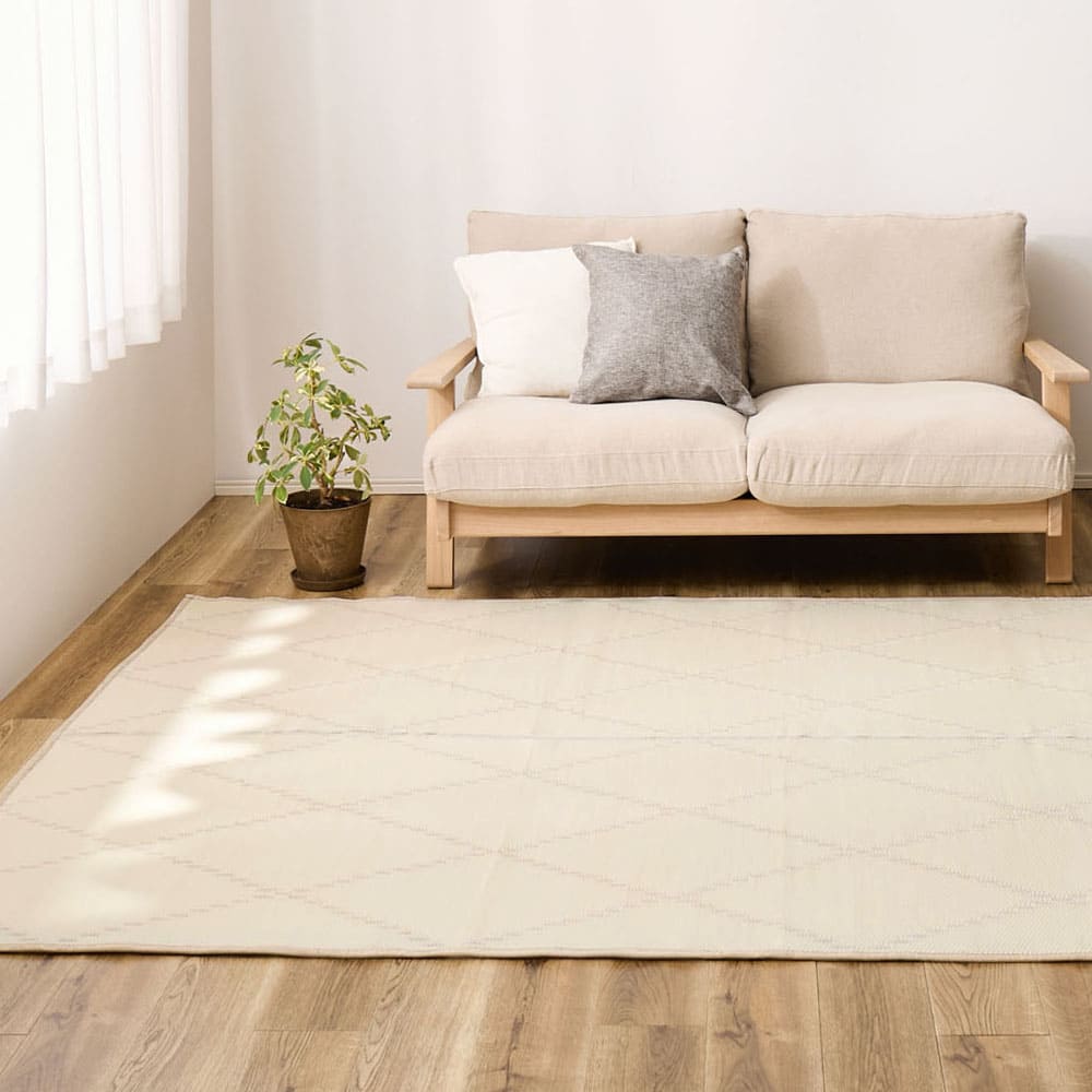 パステルカラーがかわいい、水に強い素材でできたい草風カーペット。地味な雰囲気になりがちな和室も明るくかわいいお部屋にイメージチェンジできます。傷んでしまった畳のカバーや、新しい畳の日焼けやキズの防止にも。パイプの表面に筋が入っている筋入りパイプで、肌に密着しないからベタベタしにくく、汗ばむ季節にもおすすめ。また、パイプ内の空気層の保温効果で床からの冷気を防ぐため、寒い季節でもあたたかく過ごせます。