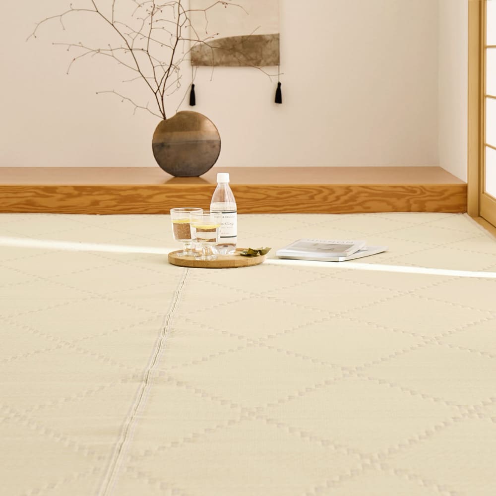 パステルカラーがかわいい、水に強い素材でできたい草風カーペット。地味な雰囲気になりがちな和室も明るくかわいいお部屋にイメージチェンジできます。傷んでしまった畳のカバーや、新しい畳の日焼けやキズの防止にも。パイプの表面に筋が入っている筋入りパイプで、肌に密着しないからベタベタしにくく、汗ばむ季節にもおすすめ。また、パイプ内の空気層の保温効果で床からの冷気を防ぐため、寒い季節でもあたたかく過ごせます。裏面は不織布貼りで、フローリングなど床への傷が心配な場所でも安心です。