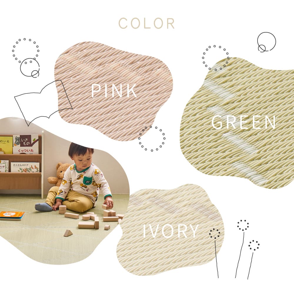 パステルカラーがかわいい、水に強い素材でできたい草風カーペット。地味な雰囲気になりがちな和室も明るくかわいいお部屋にイメージチェンジできます。傷んでしまった畳のカバーや、新しい畳の日焼けやキズの防止にも。パイプの表面に筋が入っている筋入りパイプで、肌に密着しないからベタベタしにくく、汗ばむ季節にもおすすめ。また、パイプ内の空気層の保温効果で床からの冷気を防ぐため、寒い季節でもあたたかく過ごせます。裏面は不織布貼りで、フローリングなど床への傷が心配な場所でも安心です。