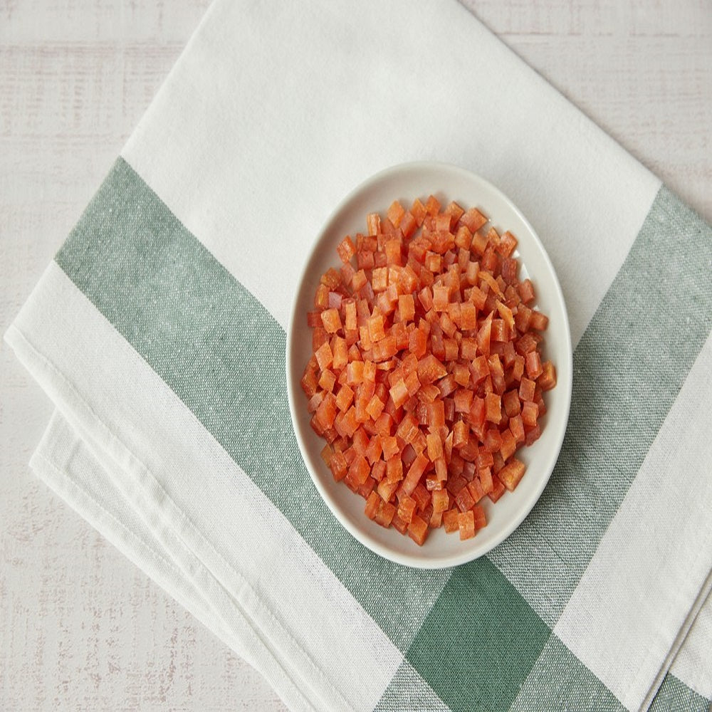 農林水産省より指定加熱処理施設として認定された工場で製造しています。愛犬の健康に配慮し、無着色にしています。飼育環境やエサにこだわり、厳しく管理された安全なささみ肉を使用しています。低温でじっくり加熱することで素材を生かし、子犬から老犬まで食べやすいよう仕上げました。ごはんのトッピングにも、βカロテン・食物繊維豊富な緑黄色野菜入りで食べやすいキューブタイプです。