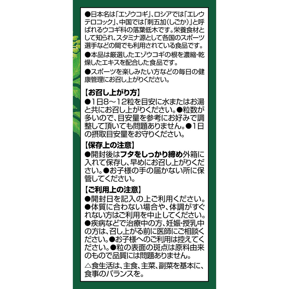 製品10粒(2.5g)当たり:エゾウコギ乾燥濃縮エキス末 100mg(エゾウコギとして3g)