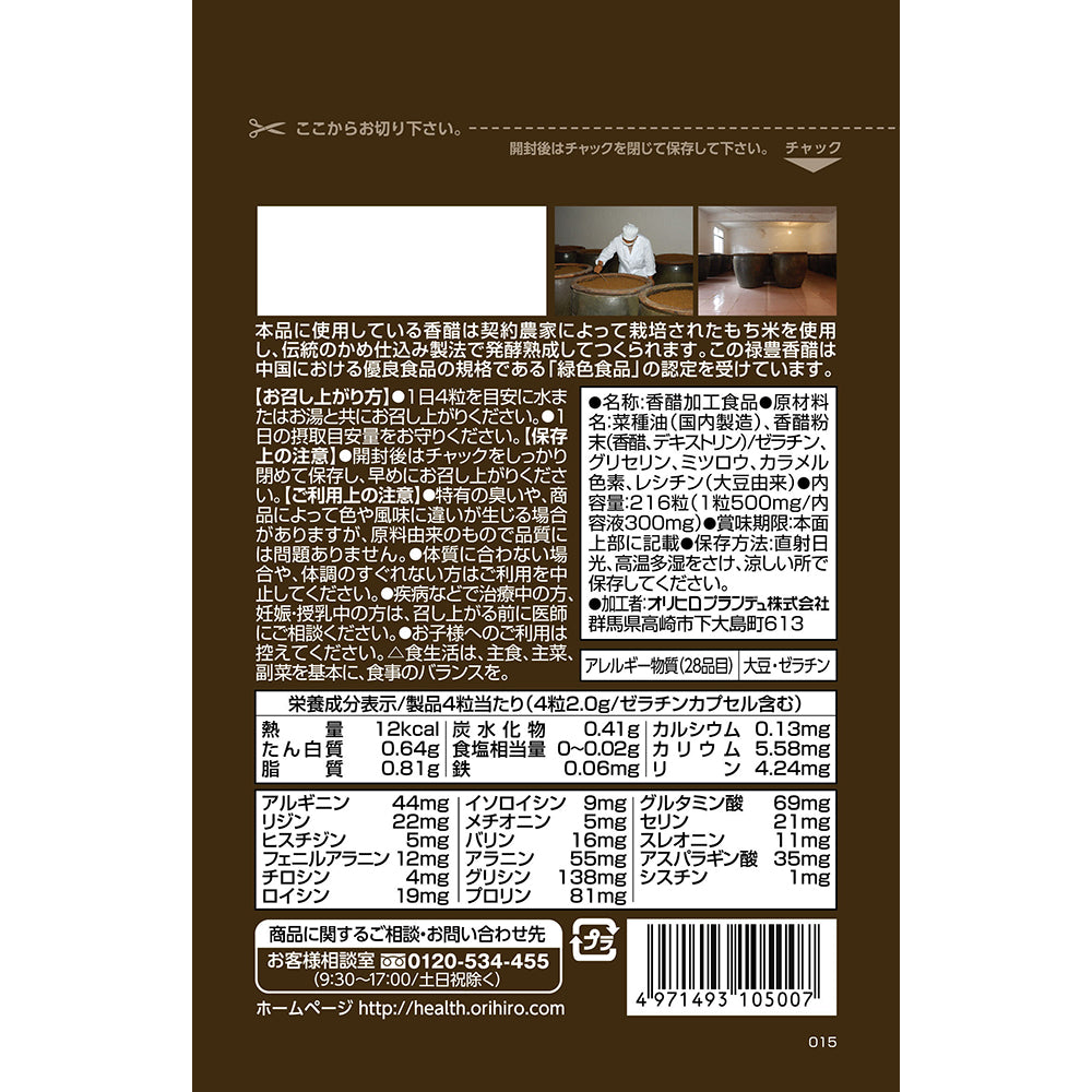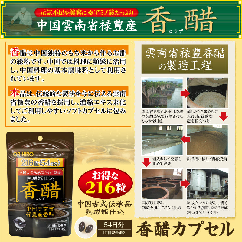 伝統的な製法を今に伝える中国雲南省禄豊産のアミノ酸が豊富な香醋を濃縮エキス末化し、ご利用しやすいソフトカプセルにしています。