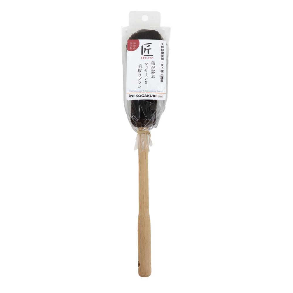 一般的に流通しているパーム素材ではなく棕櫚と呼ばれる毛並みが柔らかく弾力性のある素材を使用。材料にこだわり、農薬や消毒薬を使用することなく作り上げているため、安心してお使いいただけます。ひとつひとつ職人により、巻き上げられており、日本製で手作りだからこその雰囲気や温かさがあります。猫のカギしっぽに見立てた可愛いロングタイプでブラッシングはもちろん、じゃらしにしてもお使いいただけます。