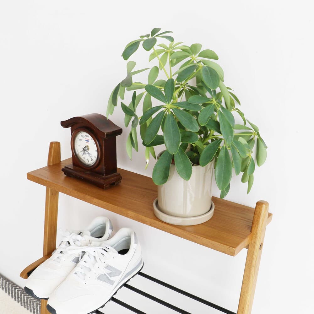 木目調の棚板とスチールフレームの組み合わせが、スタイリッシュで洗練された印象を演出。シンプルながらも上品なデザインは、ナチュラル・モダン・インダストリアルなど、さまざまなインテリアテイストに自然と溶け込み、玄関の雰囲気を損なうことがありません。