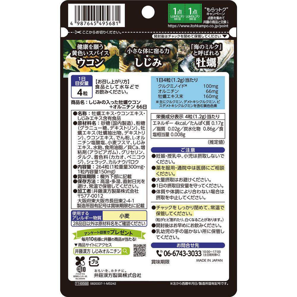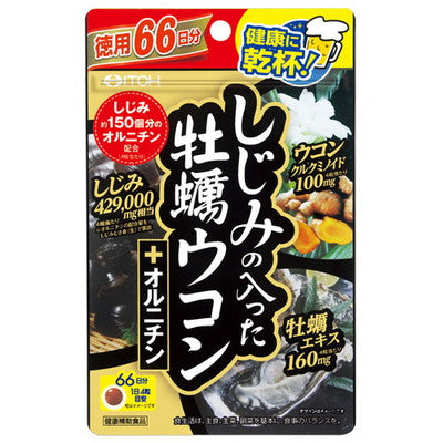 砂糖、牡蠣エキス、ウコンエキス、でん粉、L−オルニチン塩酸塩、小麦フスマ、しじみエキス、デキストリン、水飴、食用油脂、貝Ca、増粘剤(アラビアガム)、着色料(カカオ、ベニコウジ)、グリセリン、タルク、シェラック、カルナウバロウ